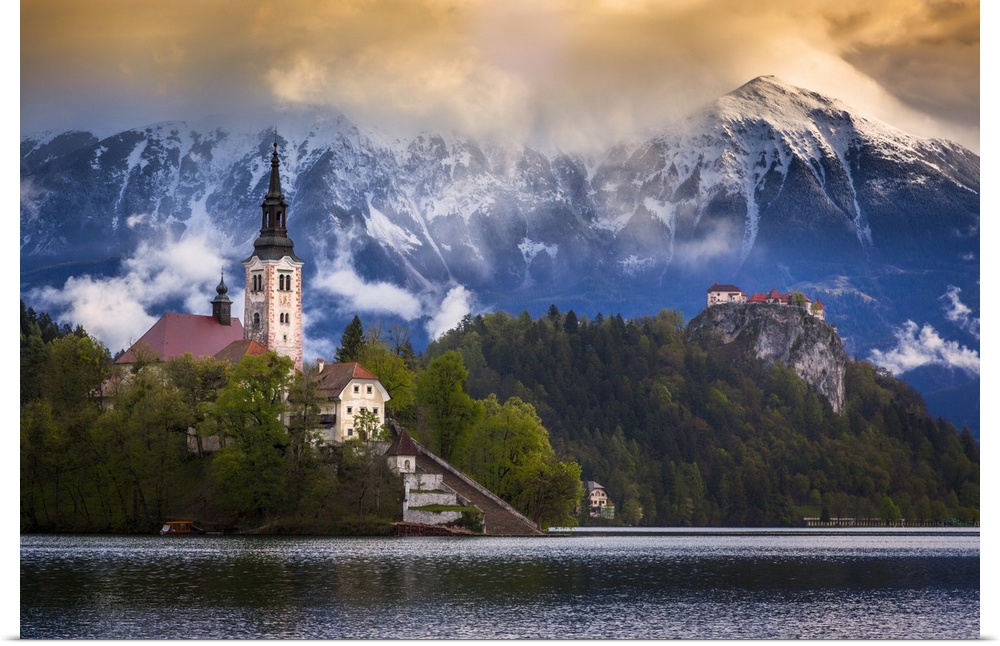 <p>Europe, Slovenia, Lake Bled. Church castle on lake island and mountain landscape. Credit: Jim Nilsen / Jaynes Gallery</p>