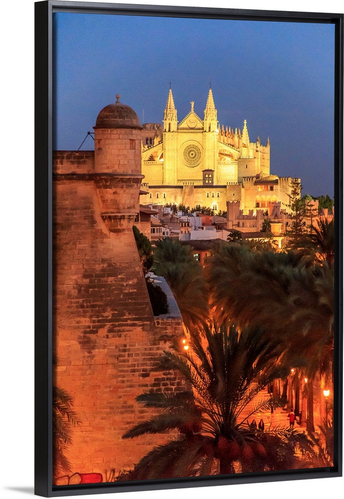 <p>Europe, Spain, Balearic Islands, Mallorca, Palma de Mallorca. La Seu, Mallorca Cathedral. Gothic. Evening, city walls.</p>