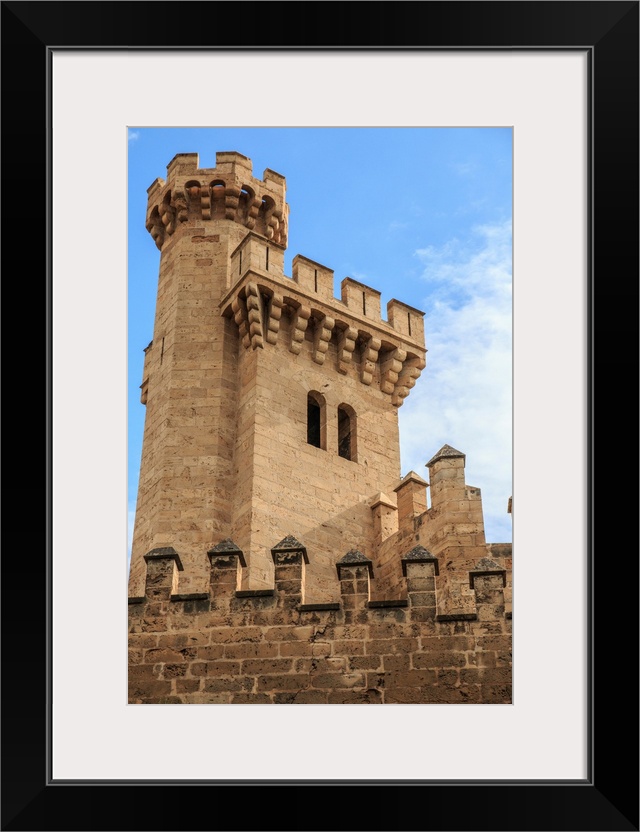 <p>Europe, Spain, Balearic Islands, Mallorca, Palma de Mallorca, stone towers, turets, of Almudaina palace.</p>