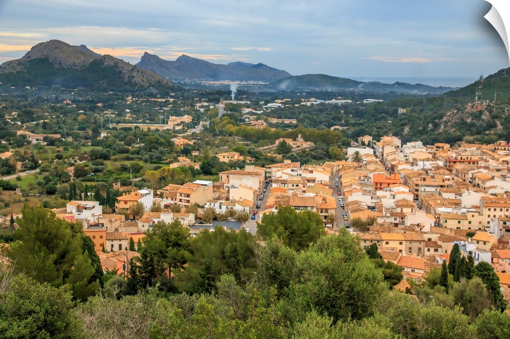 <p>Europe, Spain, Balearic Islands, Mallorca, Pollenca. territorial view from the top of stairs at Calvari, Calvary Chapel.</p>