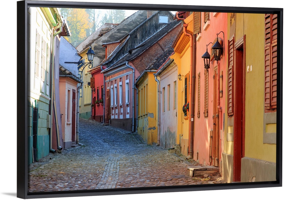<p>Europe, Transylvania, Romania, Mures County, Sighisoara, cobblestone residential street of colorful houses in village. UNESCO World Heritage Site.</p>
