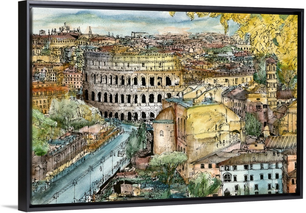 <p>Contemporary sketch with filled in color of a Rome, Italy cityscape with the Colosseum prominently in the middle.</p>