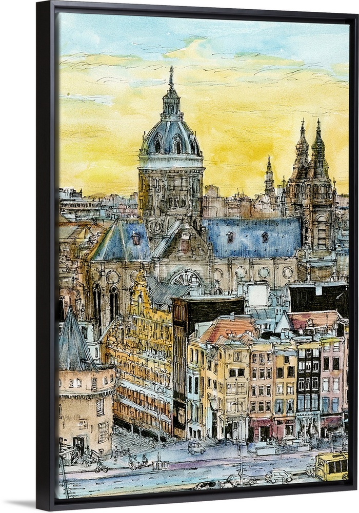 <p>Sketch filled in with color of a European cityscape at sunset.</p>