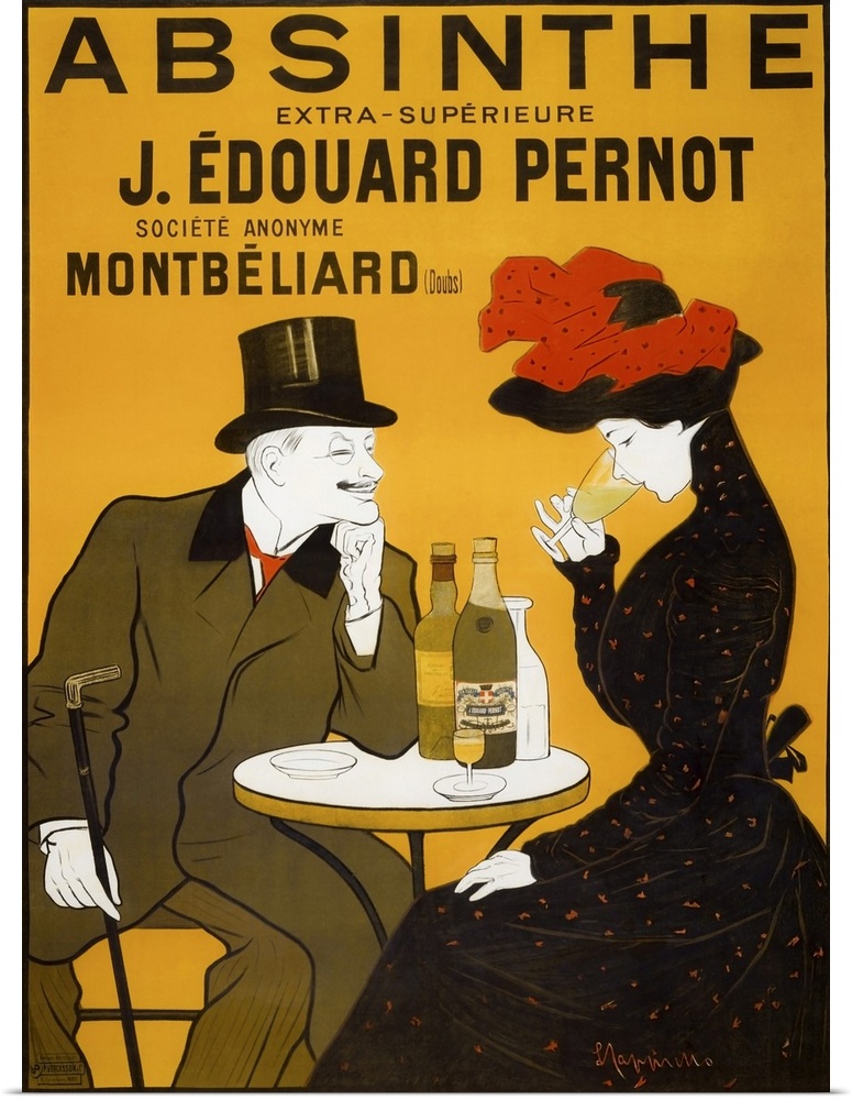 <p>European artwork featuring a man and a woman seated in a cafe, wherein the woman is sipping the man's drink, namely Absinthe, as he looks on with a smile on his face. Created by Leonetto Capiello, the print is meant to serve as an advertisement for Absinthe, an anise-flavored Liqueur Mont-Christ, while also implying the interaction between genders prevalent in that era.</p>