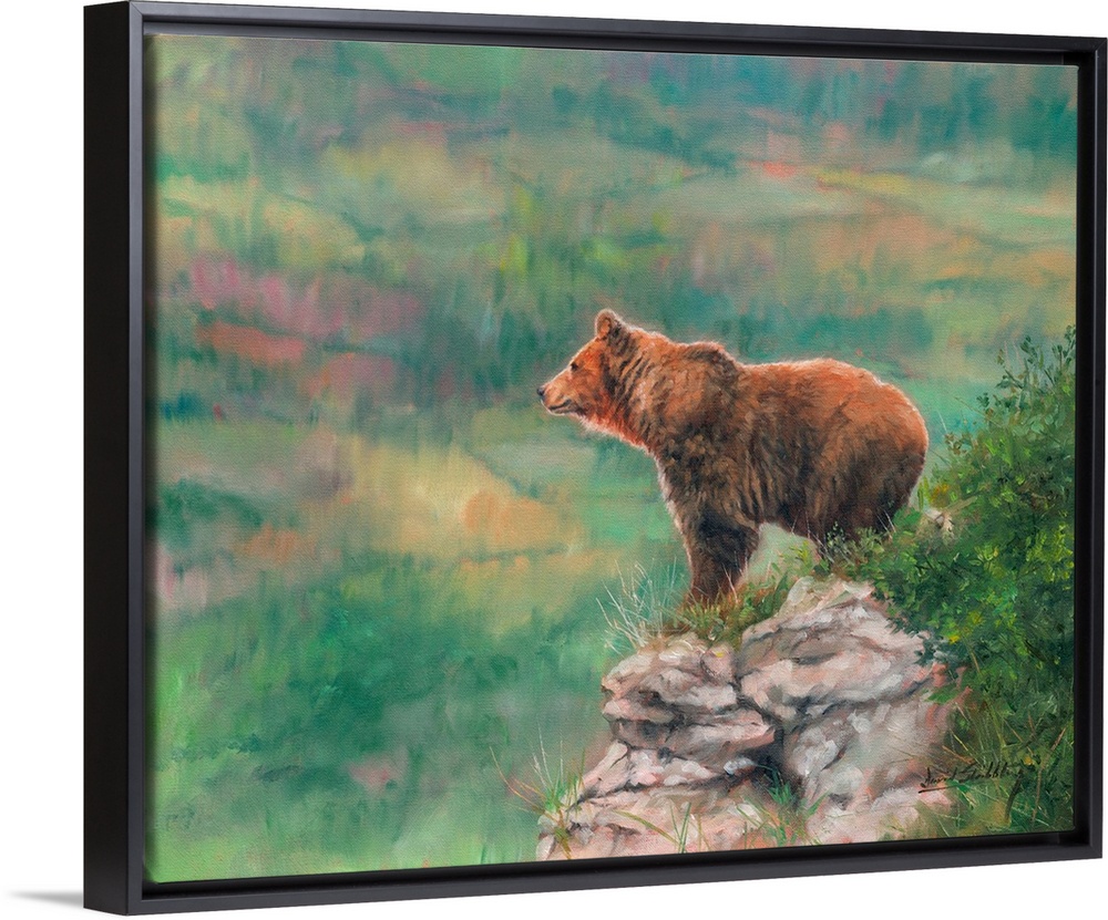 <p>Contemporary painting of a brown bear atop a rocky overlook.</p>