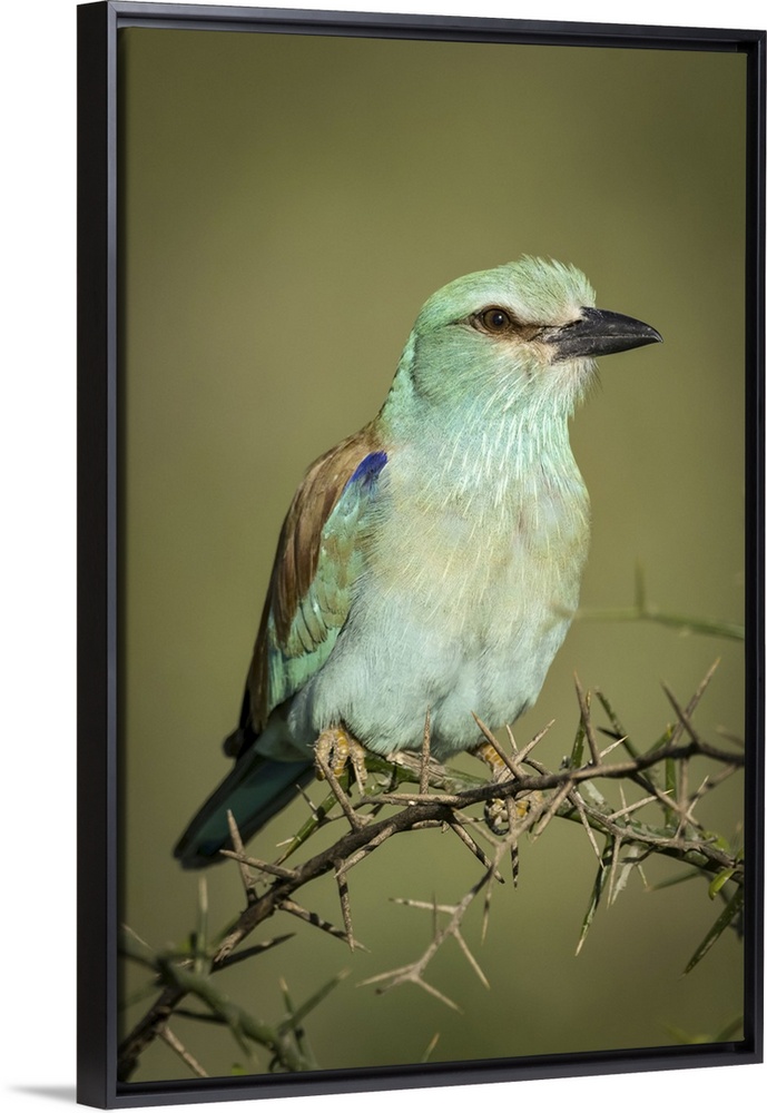 <p>European roller (coracias garrulus) on thorn branch, Serengeti national park, Tanzania.</p>