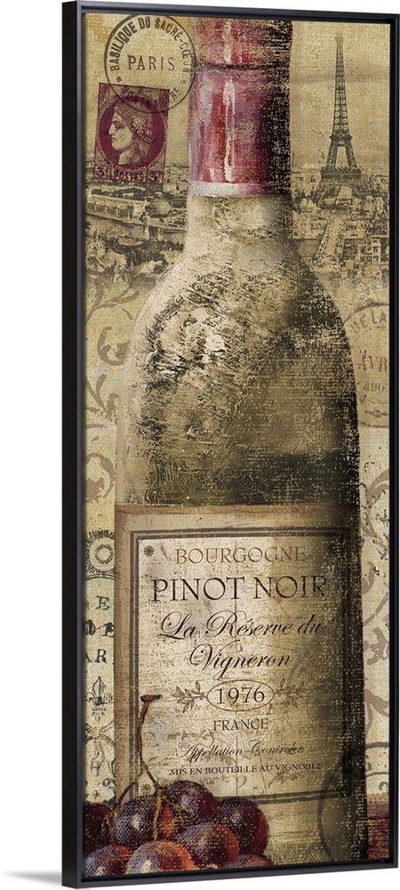 <p>A bottle of pinot noir is drawn with the city of Paris behind it and grapes that sit at the bottom left hand corner.</p>