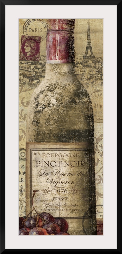 <p>A bottle of pinot noir is drawn with the city of Paris behind it and grapes that sit at the bottom left hand corner.</p>