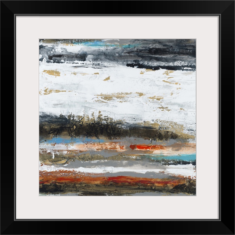 <p>Contemporary abstract painting using cool and warm tones to create horizontal lines.</p>