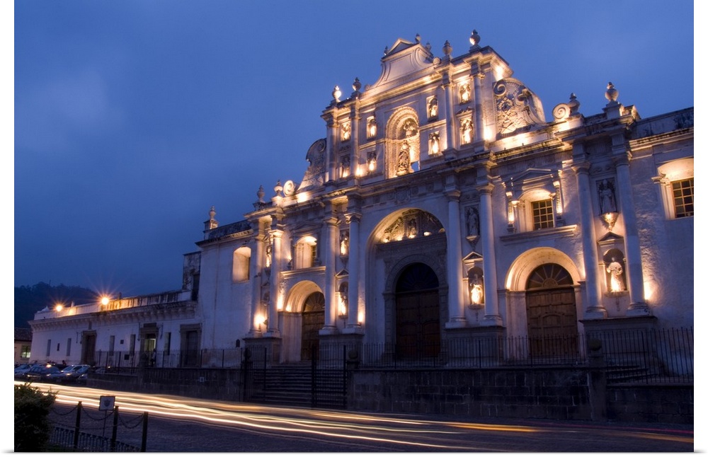 <p>Night photo of famous Cathedral de Santiago with twilight and streaks of traffic in the tourism town of Antigua, Guatemala</p>