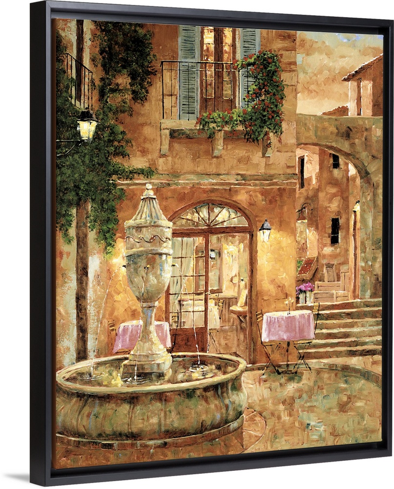 <p>A fountain outside a restaurant in Europe in the early evening.</p>