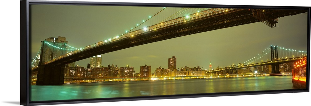 <p>Illuminated New York City skyline and suspension bridges over the East River.</p>