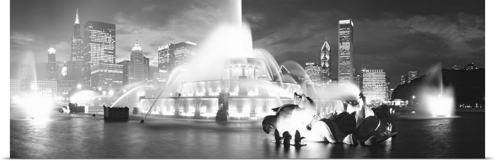 <p>Horizontal canvas of a big water fountain in Illinois with downtown building in the background.</p>