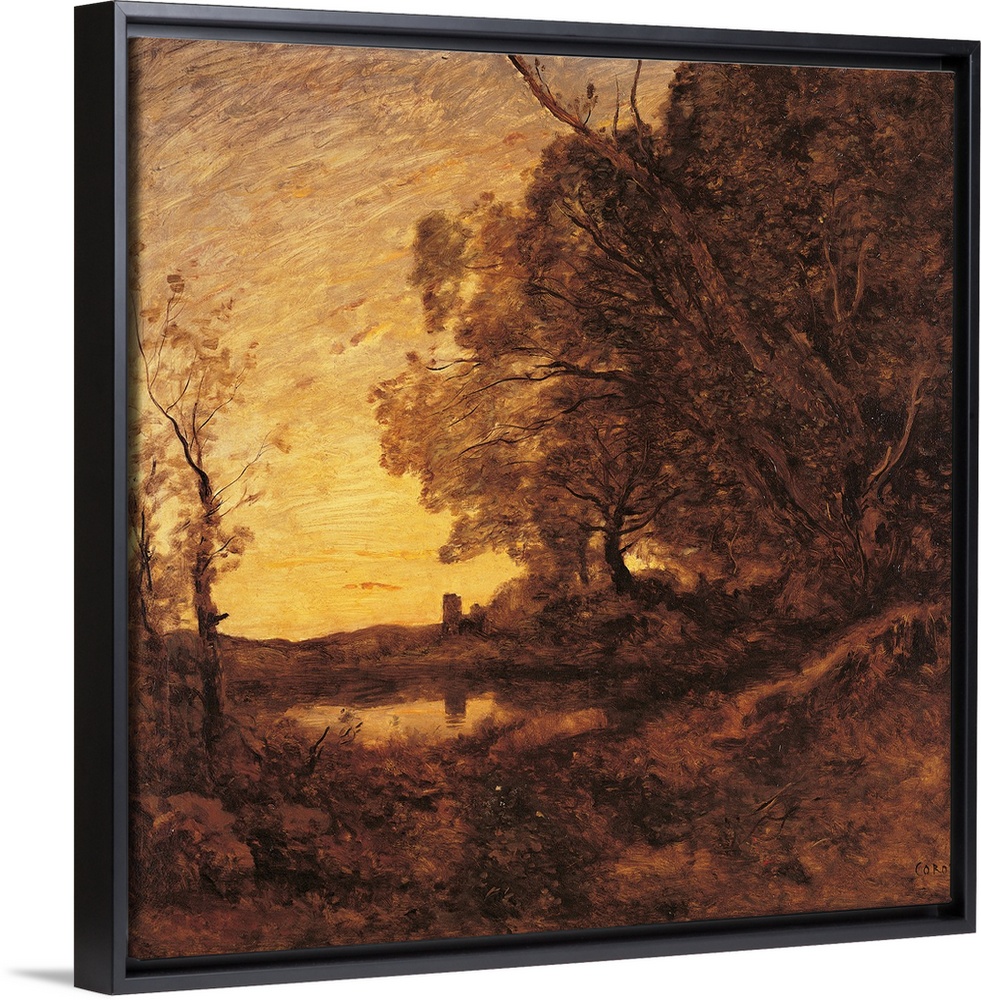 <p>Evening. Distant Tower, by Jean-Baptiste-Camille Corot, 1865 - 1870 about, 19th Century, oil on canvas, cm 109 x 116 - France, Ile de France, Paris, Muse dOrsay, RF1793. All. Evening. Distant tower wood landscape water sunset yellow trees clearing. (25222</p>