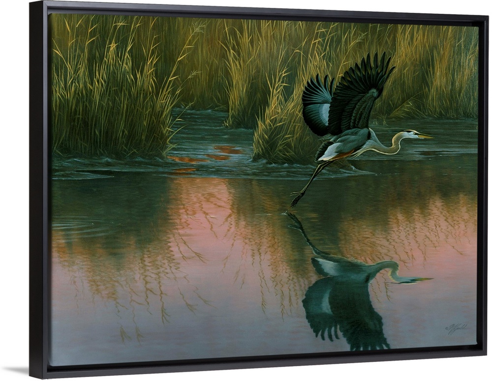 <p>A great blue heron takes off from a swamp at dusk.</p>