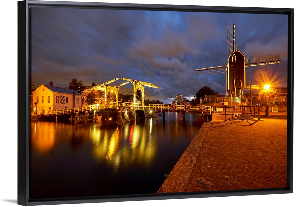 <p>View of a canal with a small bridge and windmill at night, Leiden, South Holland, Netherlands.</p>