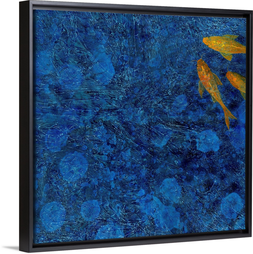 <p>Square painting with textured, deep blue water and three orange koi fish in the top right corner.</p>