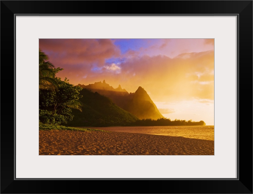 <p>Evening light on Na Pali Coast spires from Tunnels Beach, Island of Kauai, Hawaii</p>