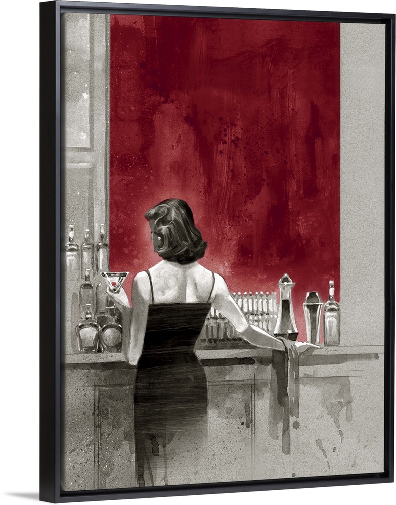 <p>A painting of a woman in a dress standing at a bar with a vibrant red wall, with a drink in her hand.</p>
