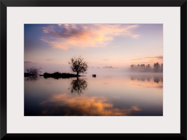 <p>A photograph of a foggy landscape with silhouetted trees being reflected in the water below.</p>