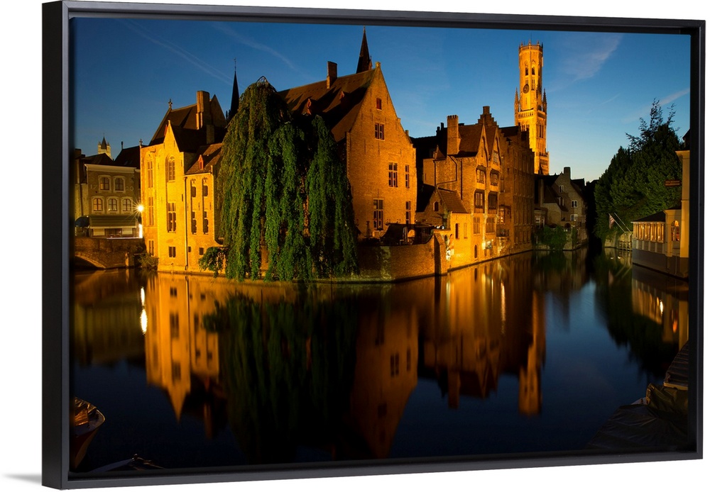 <p>Evening reflections on Rozenhoedkaai, with Belfry (Belfort) Tower, UNESCO World Heritage Site, Bruges, West Flanders, Belgium, Europe</p>