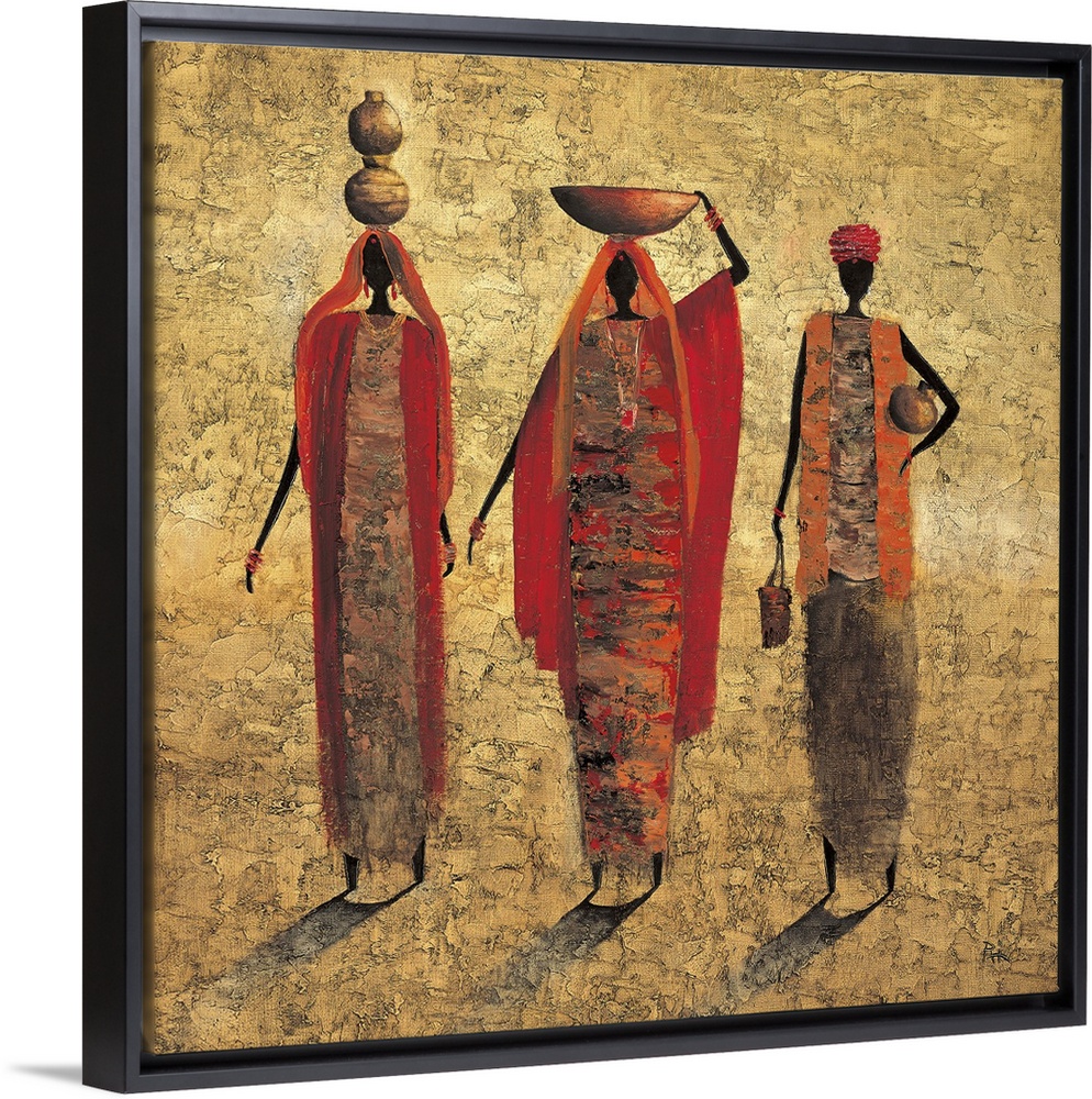 <p>Contemporary painting of tribal figures carrying food and water on their heads.</p>