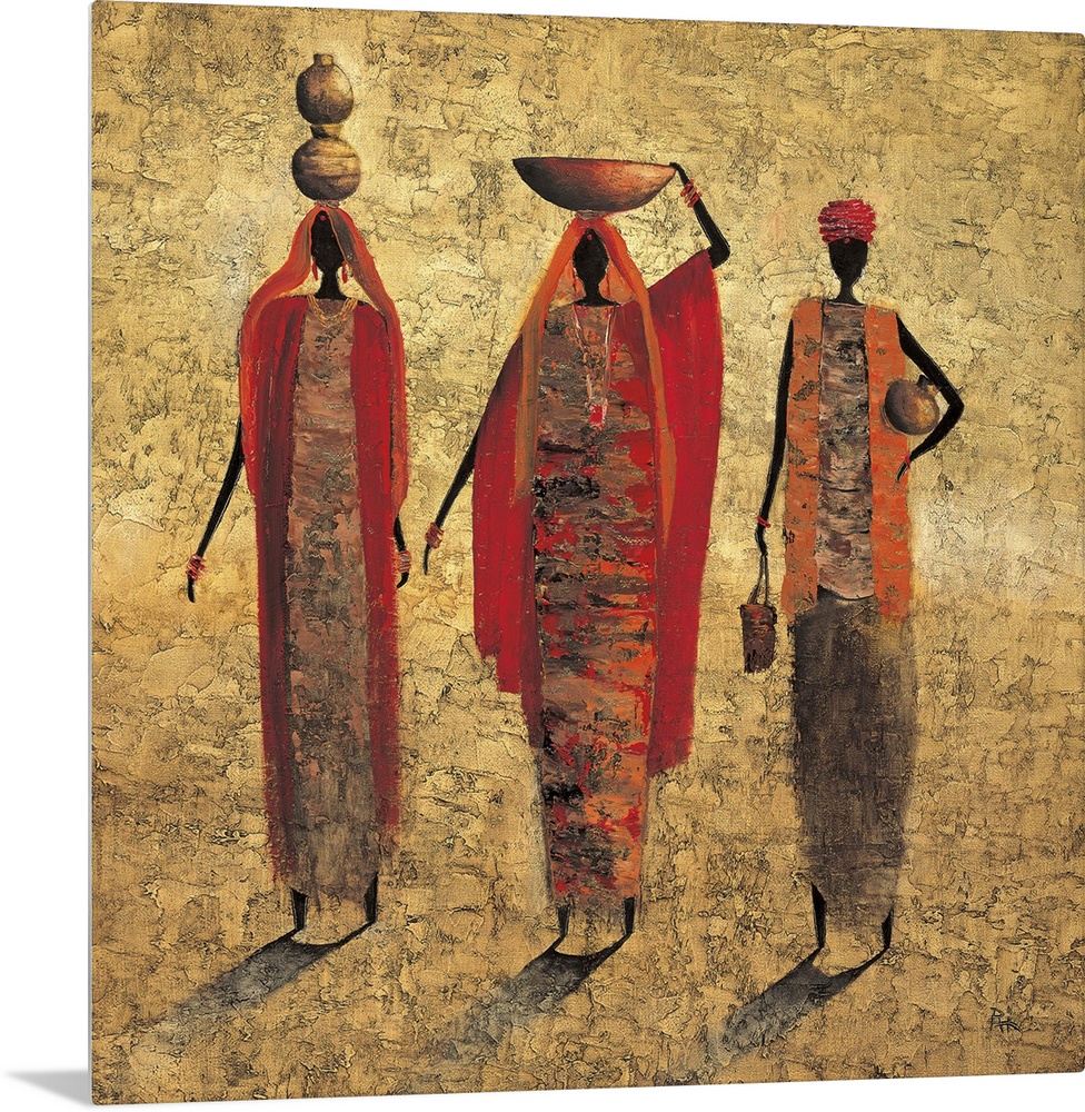 <p>Contemporary painting of tribal figures carrying food and water on their heads.</p>
