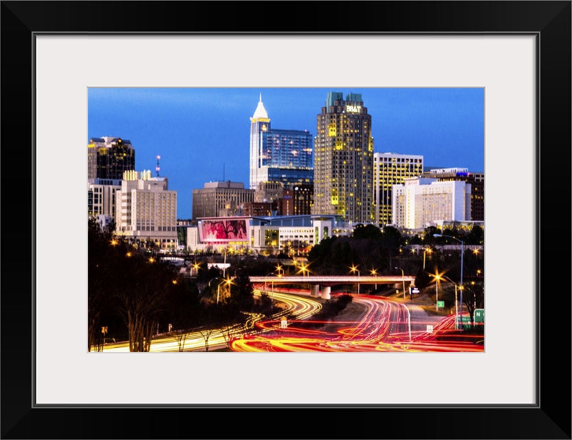 <p>Blue hour in downtown Raleigh, North Carolina, with light trails of traffic in the foreground and skyscrapers in the background.</p>
