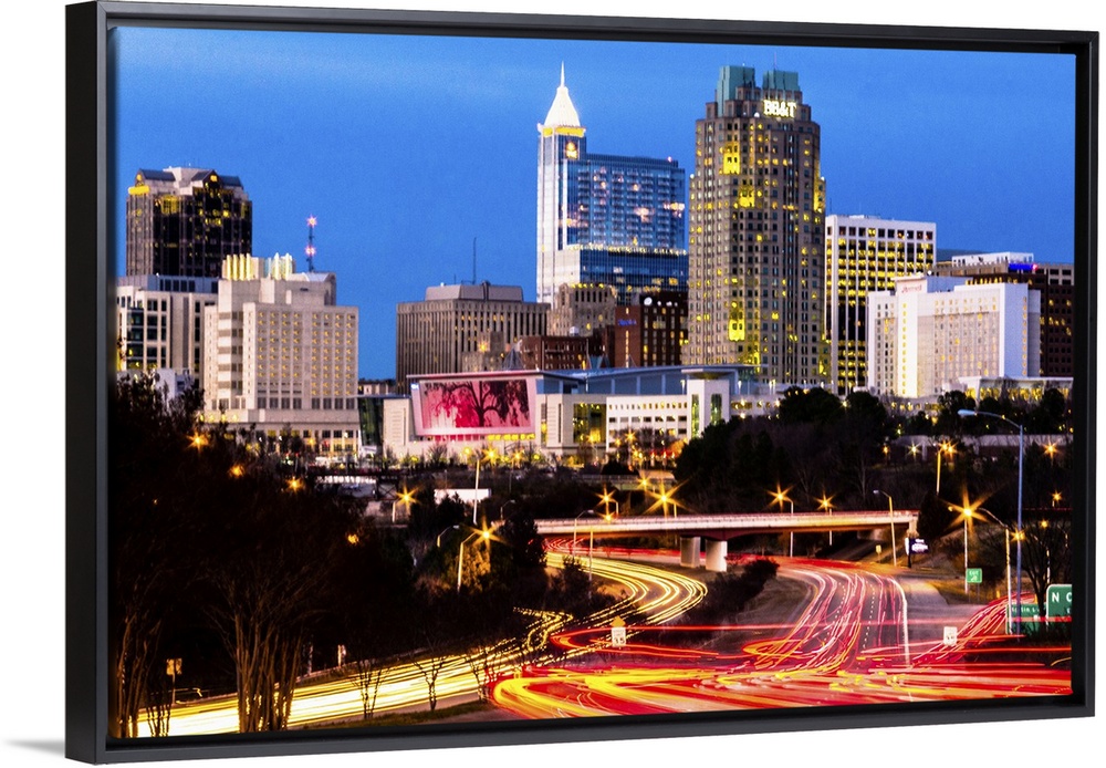 <p>Blue hour in downtown Raleigh, North Carolina, with light trails of traffic in the foreground and skyscrapers in the background.</p>