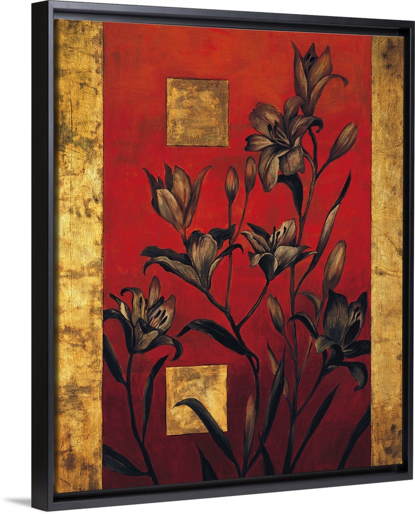 <p>Contemporary painting of lilies on a bold red background with two golden squares and a vertical gold line on each side.</p>