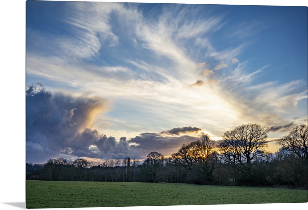 <p>Dramatic evening sky over the West Sussex landscape near Nutbourne in England.</p>
