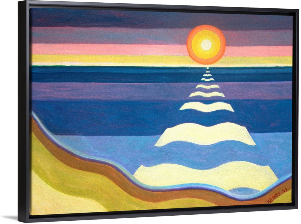<p>An oil painting of a setting sun creating a pathway from it's rays on to the water and beach.</p>