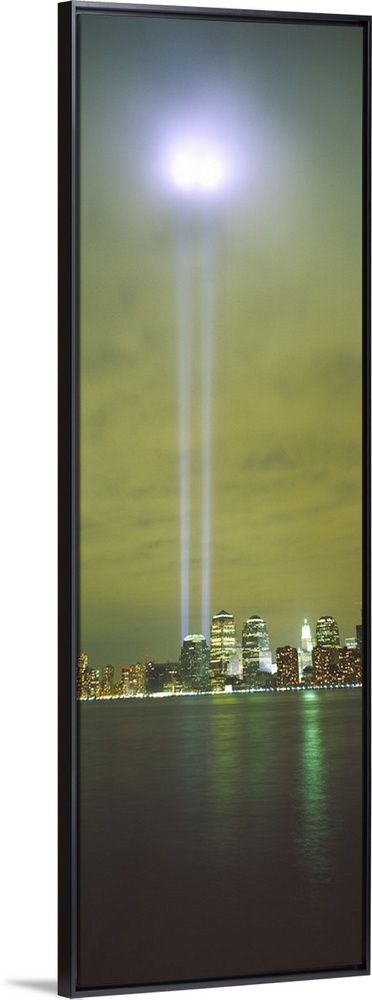 <p>Vertical panoramic piece of a photograph of the lights shining up from where the twin towers stood.</p>