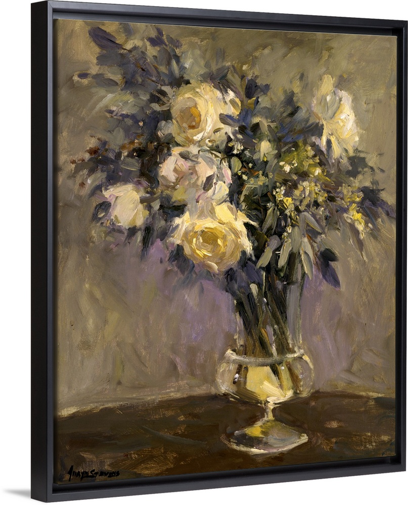 <p>Fine art oil painting still life of yellow roses and lavender flowers in a clear glass vase on a table by Allayn Stevens.</p>