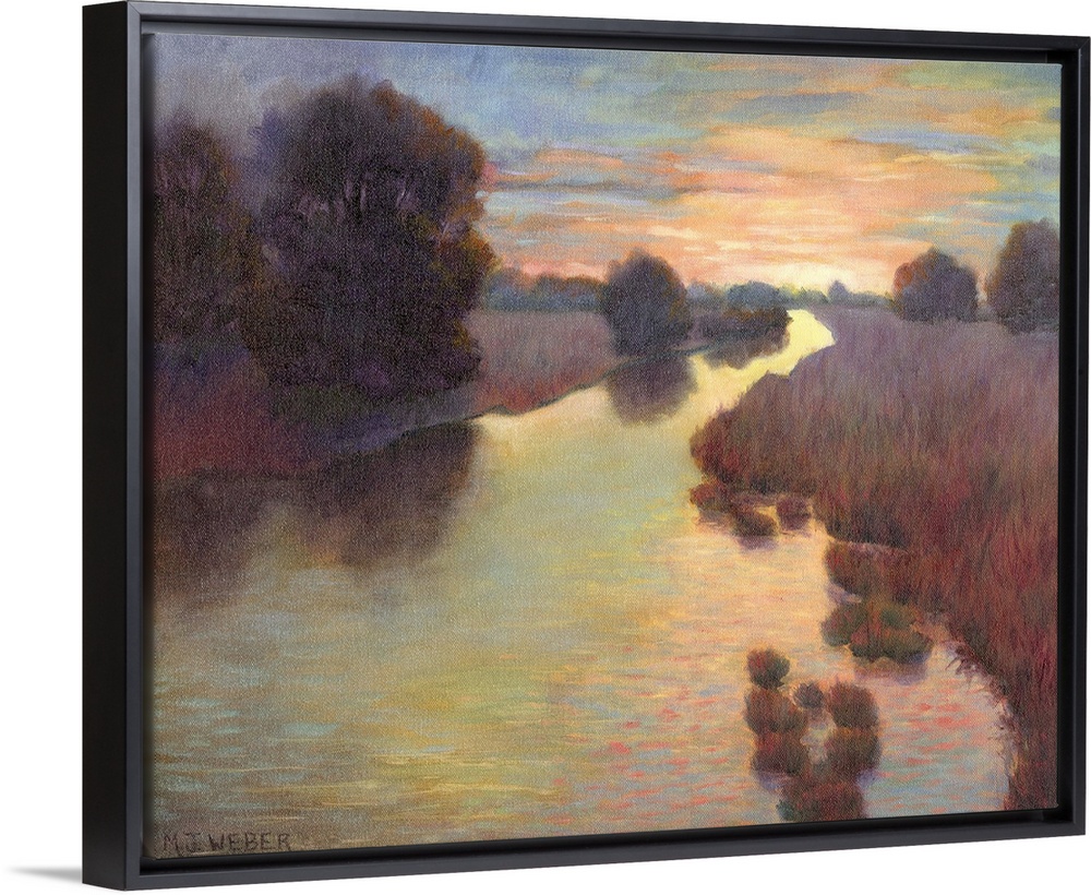 <p>Contemporary landscape painting of a winding river through a sunset drenched landscape.</p>