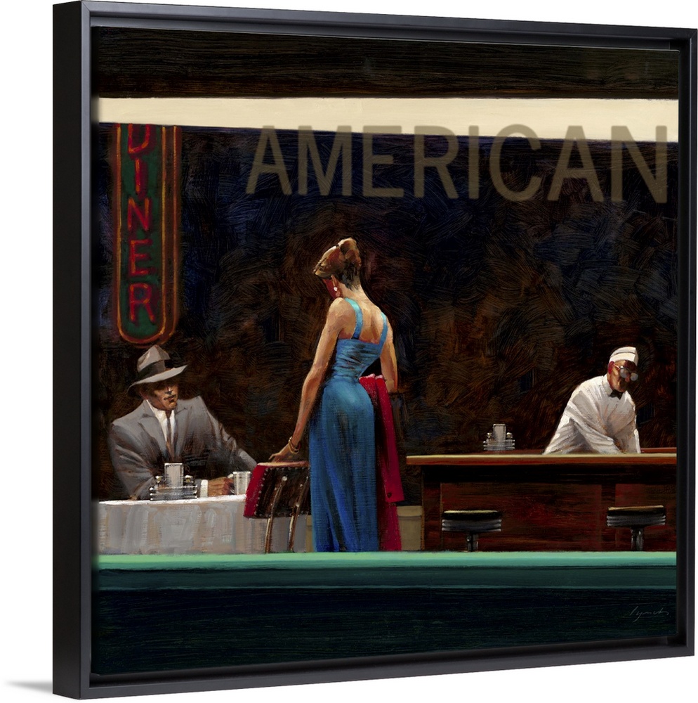 <p>Contemporary painting looking through the window of a diner at night, with a woman in a blue dress approaches a man sitting at a table.</p>
