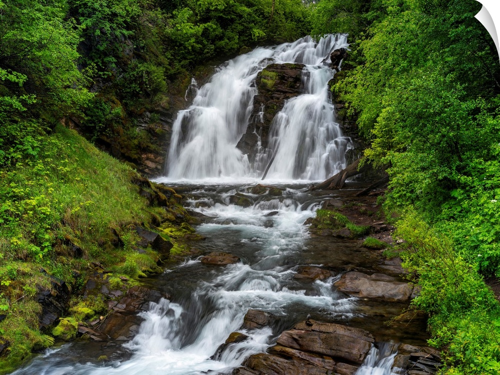 <p>A waterfall surrounded by lush green forest in the Canadian Rocky Mountains.</p>