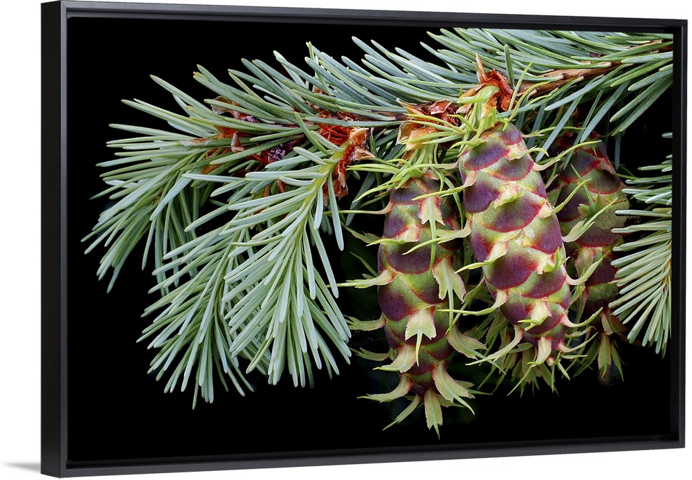 <p>Giant, landscape, close up photograph of an evergreen branch with several pinecone seedlings at the end of the branch, on a solid black background.</p>