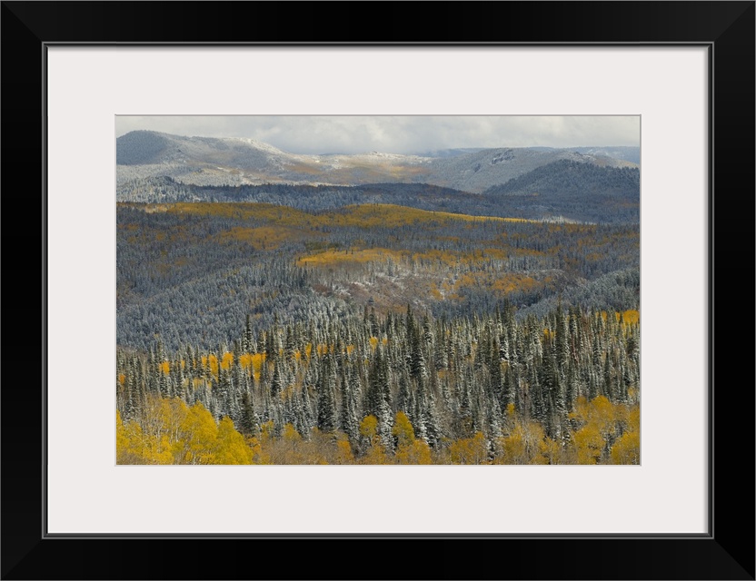 <p>Evergreens and Aspens, Fall Snow storm near Encampment, Wyoming, Aspen Alley, Battle Mountain Pass, Medicine Bow Mountains and National Forest.</p>