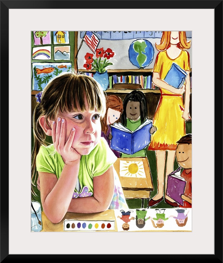 <p>A watercolor portrait of a child with a juvenile drawing of a classroom in the background.</p>