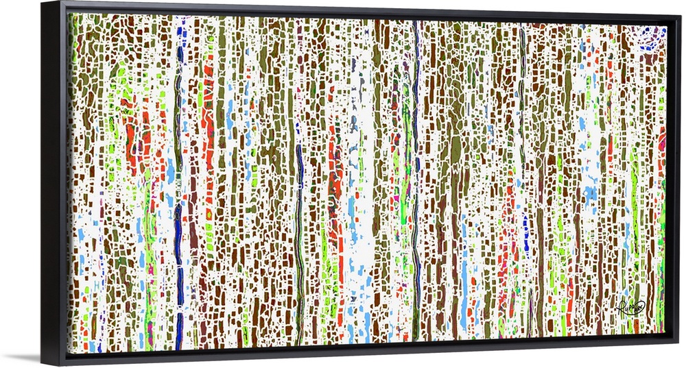 <p>Abstract art that has colorful, broken up, vertical lines on a white background.</p>
