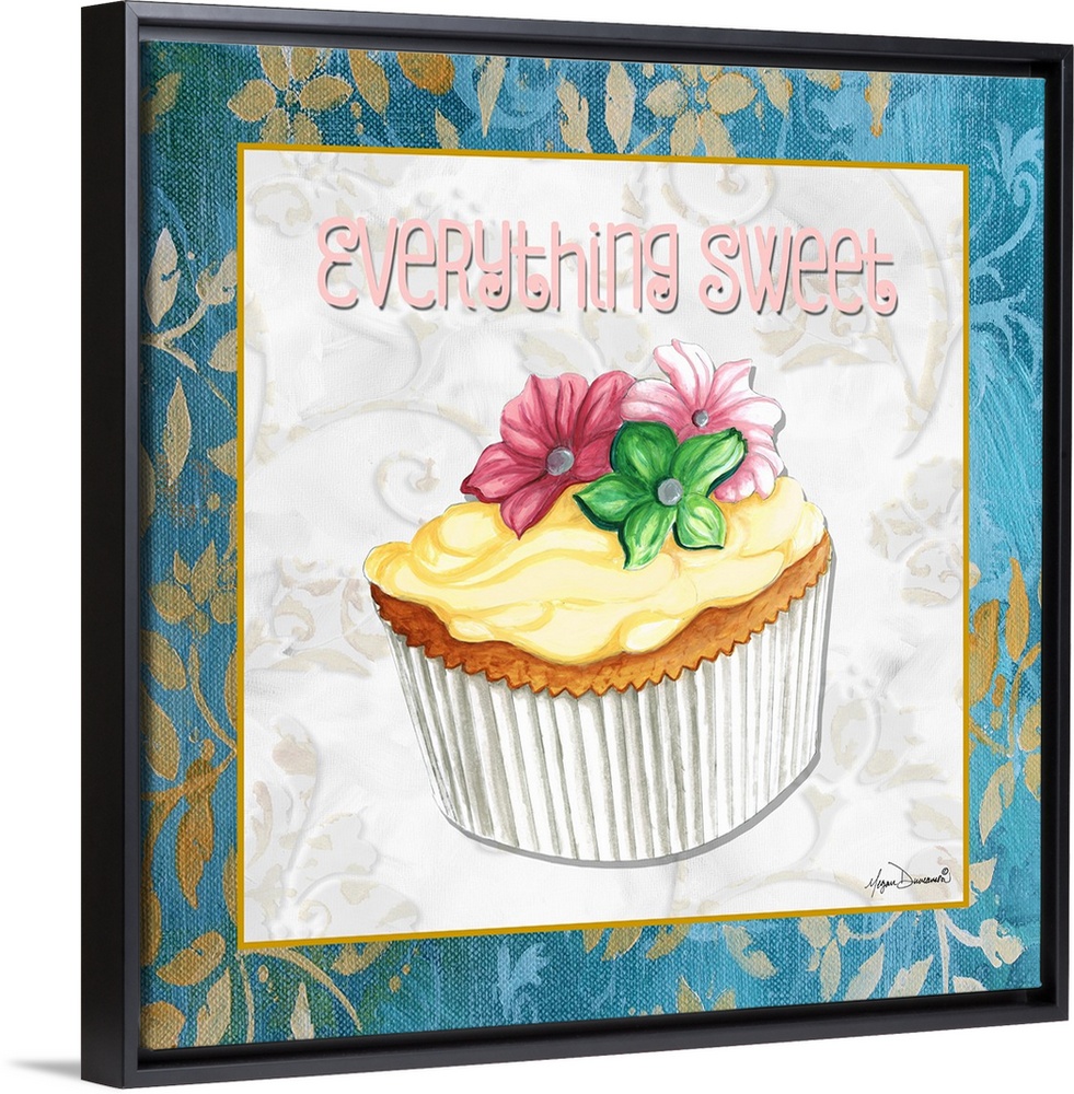 <p>A square panel featuring a cupcake decorated with three flowers and vanilla frosting.</p>