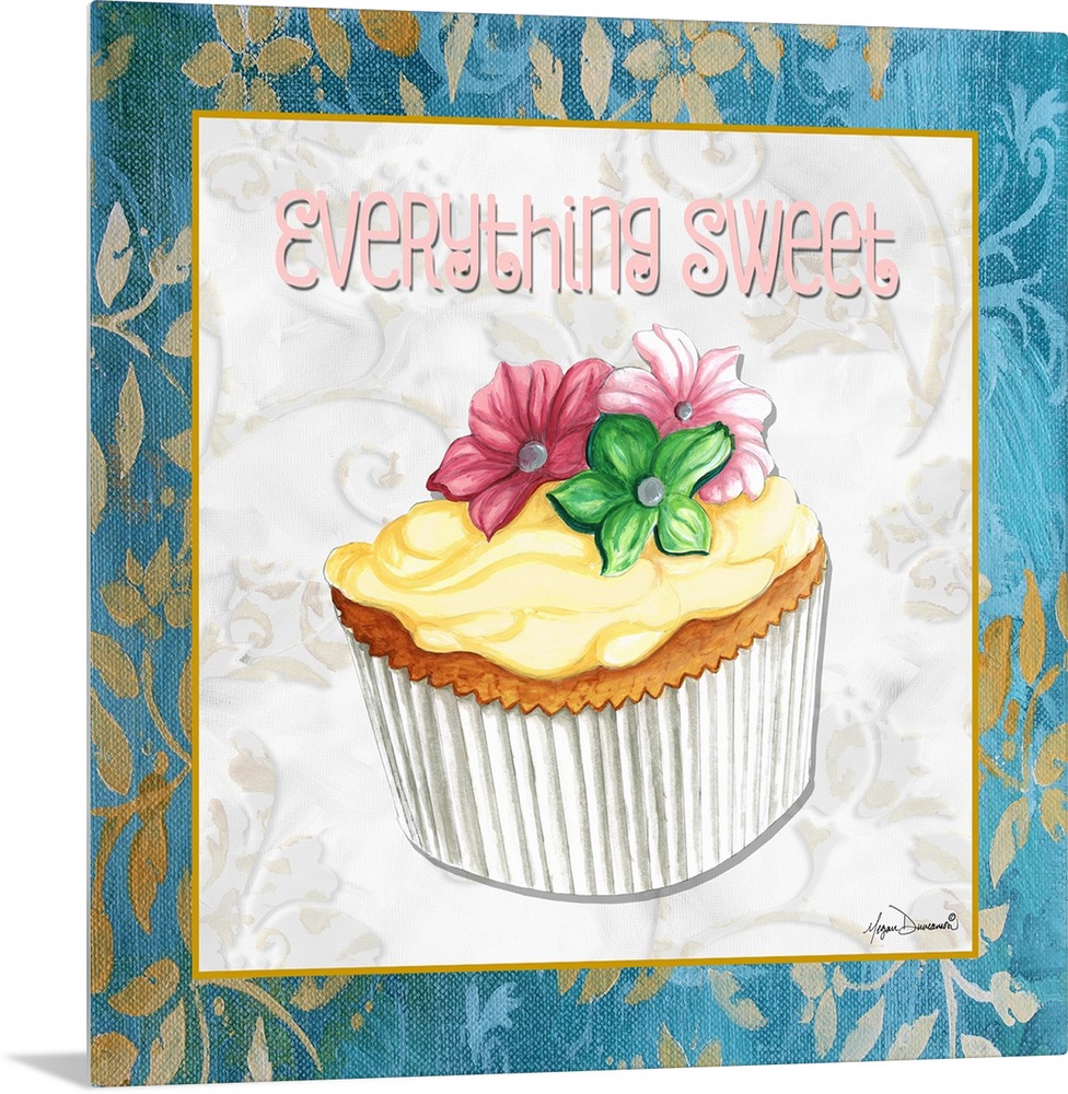 <p>A square panel featuring a cupcake decorated with three flowers and vanilla frosting.</p>