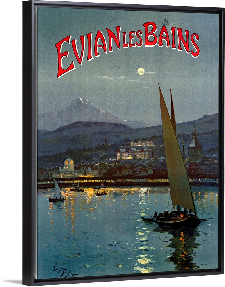 <p>Big, vertical vintage travel advertisement for Evian les Bains of several sailboats in the moonlit waters in front of a city landscape at night, a mountain landscape in the background.</p>