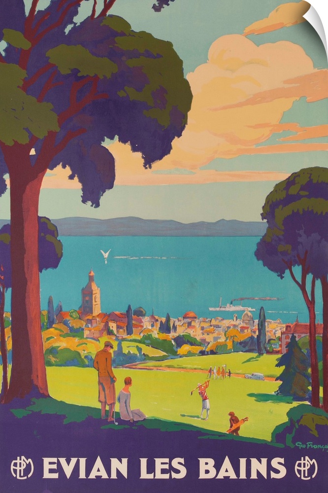 <p>ca 1920s ca Geo Francois, bucolic scene of golfers playing at seaside resort.</p>