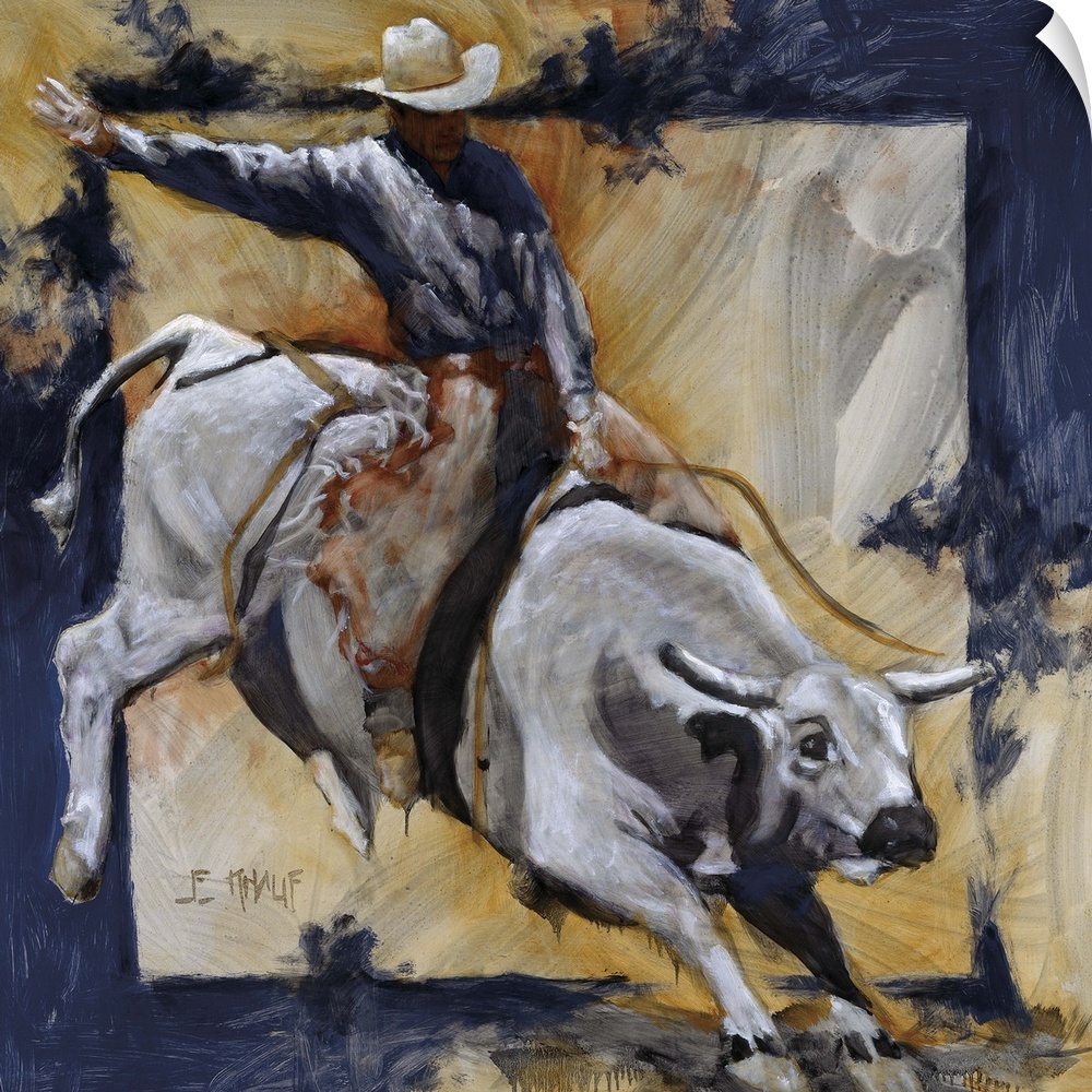 <p>Western themed contemporary painting of a cowboy riding a bucking bull.</p>