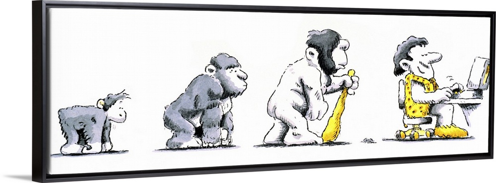 <p>Evolution of man. Cartoon depicting man evolving from apes, through various stages, until reaching its pinnacle with a man at a desk typing into a computer. Illustration by Lutz Lange.</p>
