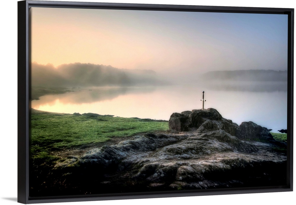 <p>Excalibur legendary sword blocked inside a rock with a lake and fog behind in Broceliande forest in France, Brittany area.</p>