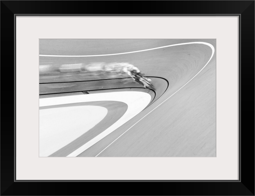 <p>Black and white image of a cyclist in a velodrome coming around a curve.</p>