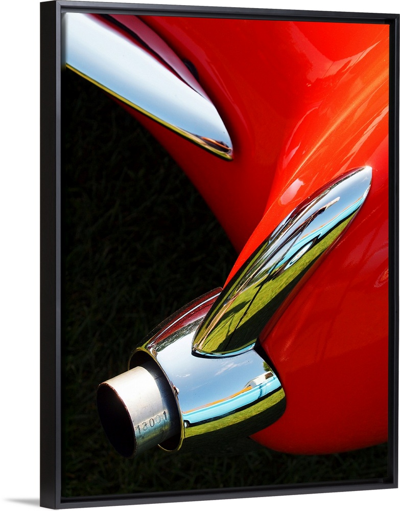 <p>Photograph of the rear exhaust on a red 1956 Corvette.</p>